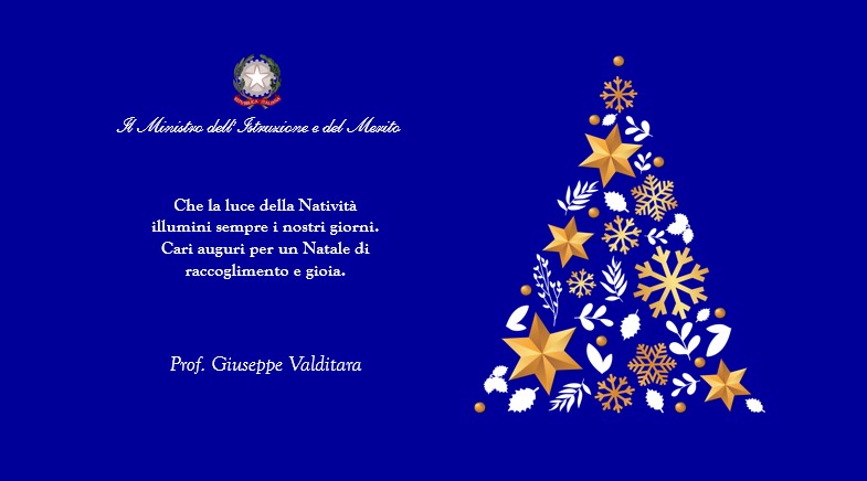 La cartolina spedita dal Ministro prof. Giuseppe Valditara a tutti i docenti, supplenti o di ruolo, come augurio in vista delle Festività Natalizie.